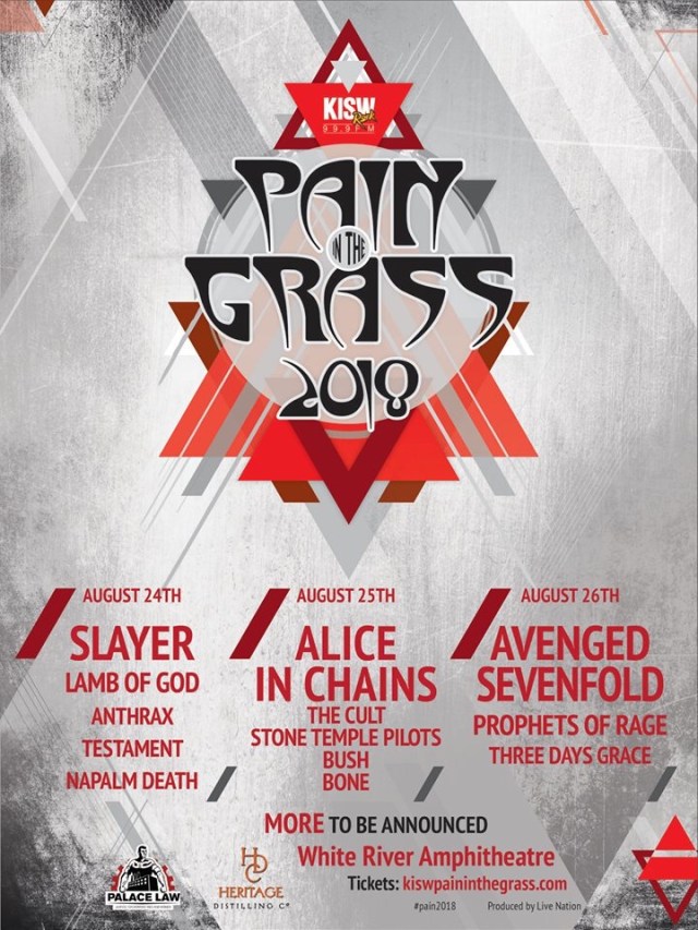 Now if you’re still up for more, Alice In Chains is in concert Saturday August 25th at White River Amphitheater in Auburn, WA. KISW 99.9FM puts on Pain in the Grass every summer. Here’s the event poster (note Sunday’s event has been cancelled). For more information on Alice In Chains’ concert, go to-