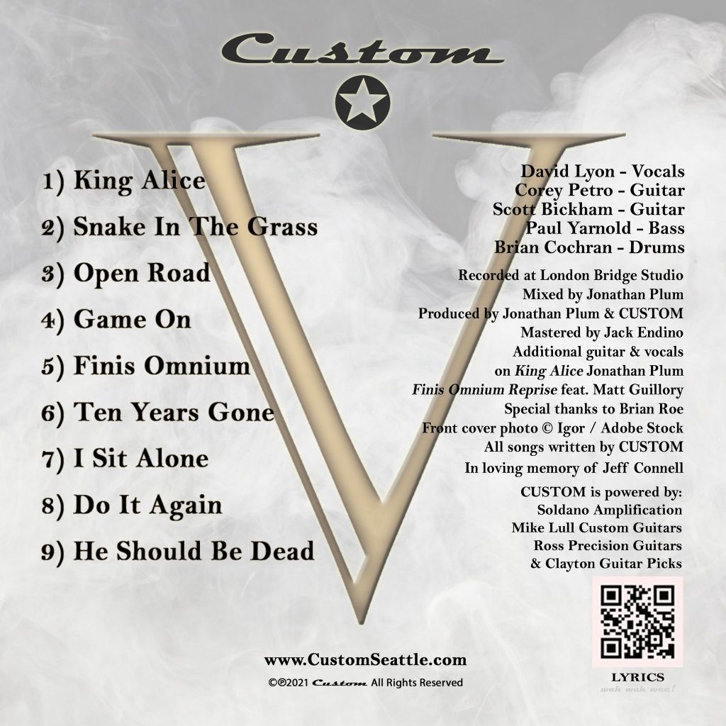 Listening to the album is also a lifetime experience. The party just keeps going – from the first gritty scratches of King Alice to the playful storytelling of He Should Be Dead and the rainy sounds of Finis Omnium. The entire album blends a heavy low end with Corey’s incendiary guitar solos, David’s confident power vocals, and welcome variety. Dare I saw it’s “Driving Music?” I will, and it is. The final product is testament to the talent and signature style of our local music scene, and to Custom in particular.